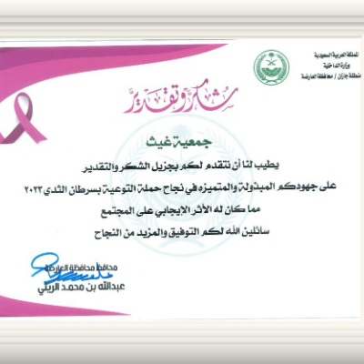 شكر وتقدير لجمعية غيث على جهودهم المبذولة في حملات التوعية بسرطان الثدي